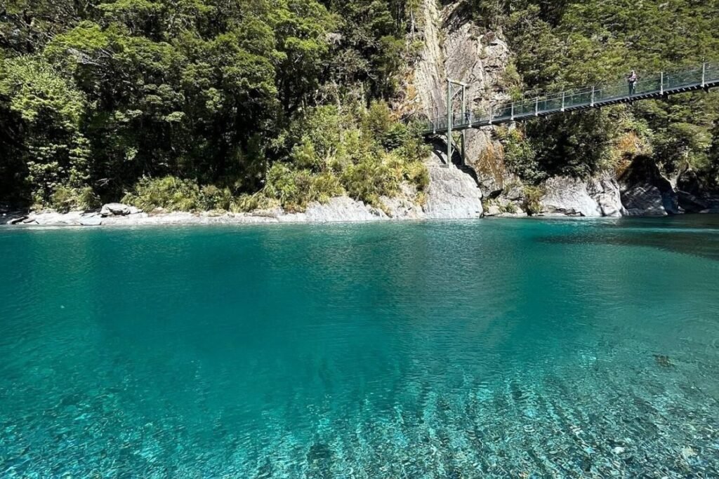 The Blue Pools Track is a reminder that you don’t always need a long tramp to find something unforgettable. The short walk takes you through cool native beech forest and across suspension bridges, opening onto pools of crystal-clear turquoise water fed by the Makarora River. The pools glow differently depending on the light — sometimes deep blue, other times bright green.