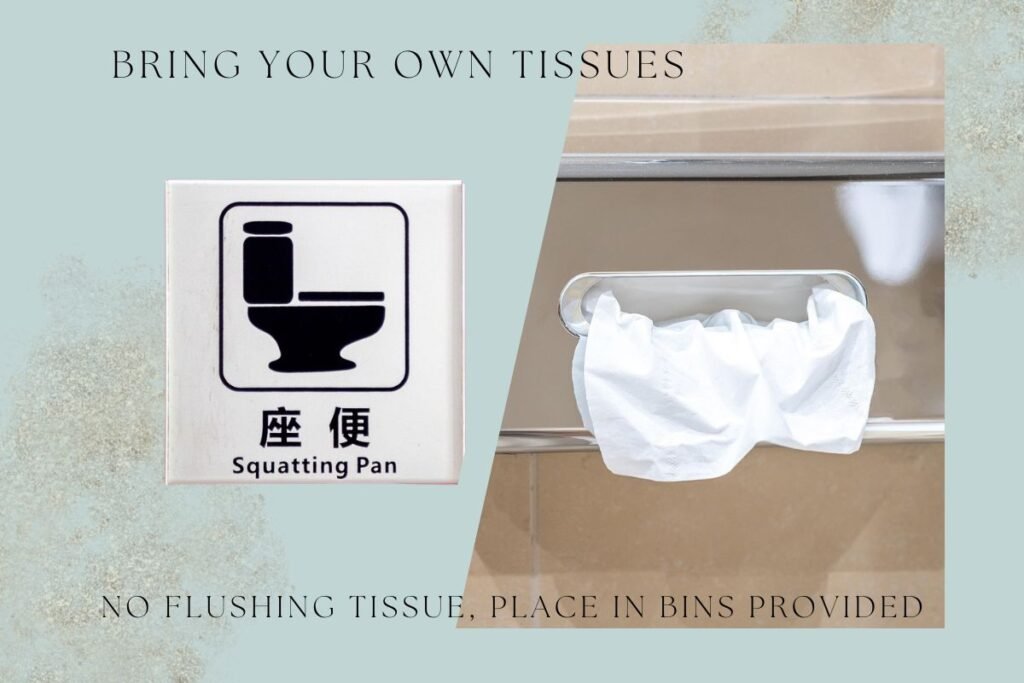 • Toilet paper is not flushed. Used paper goes into the bin beside the toilet