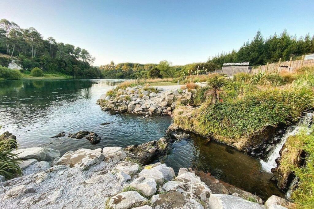 Features: Natural hot stream meeting the Waikato River, riverside platforms, changing rooms, toilets, car park, picnic spots, riverside walk to Huka Falls.