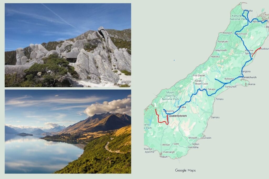Christchurch • Hanmer Springs • Lewis Pass • Punakaiki • Greymouth • Hokitika • Haast Pass • Wānaka • Blue Pools • Cardrona • Queenstown • Lake Pukaki • Aoraki Mount Cook • Lake Tekapo • Christchurch
