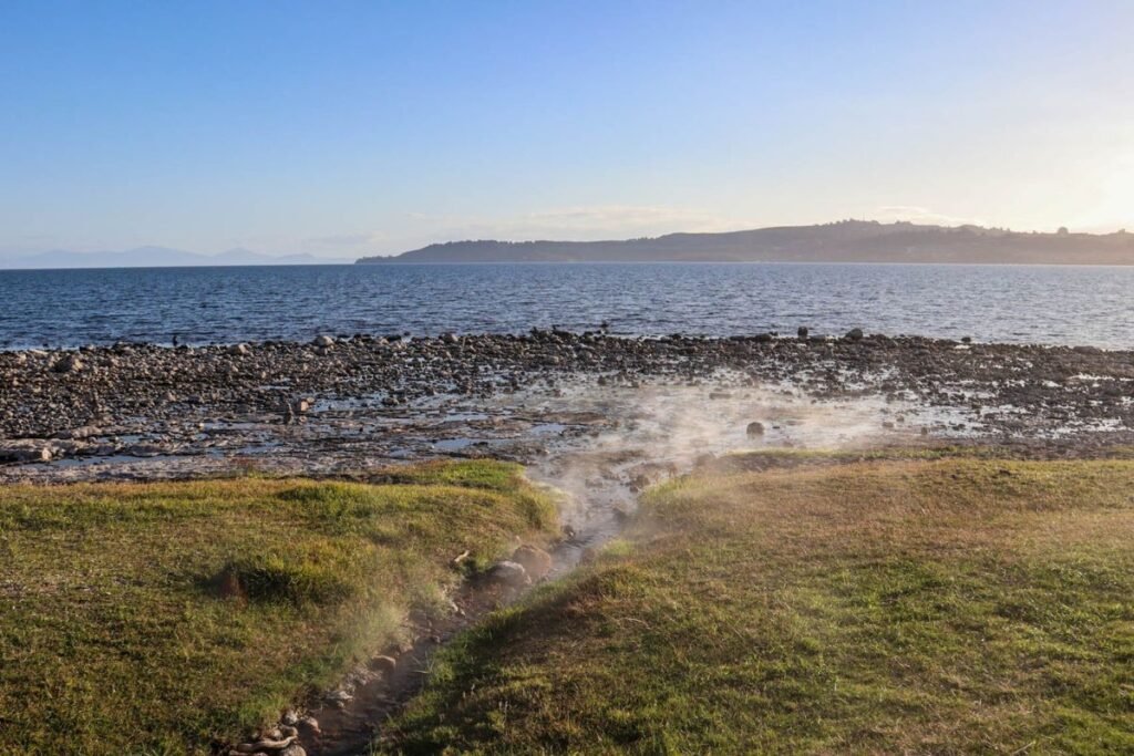 Geothermal activity isn’t limited to one place — there are several hot spots along the lake’s foreshore where warm water bubbles up through the sand and lakebed. The most popular is often called Hot Water Beach, where you can sit in shallow pools and feel the heat rising through the ground.